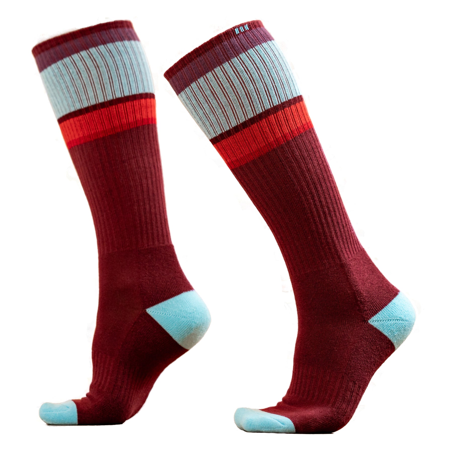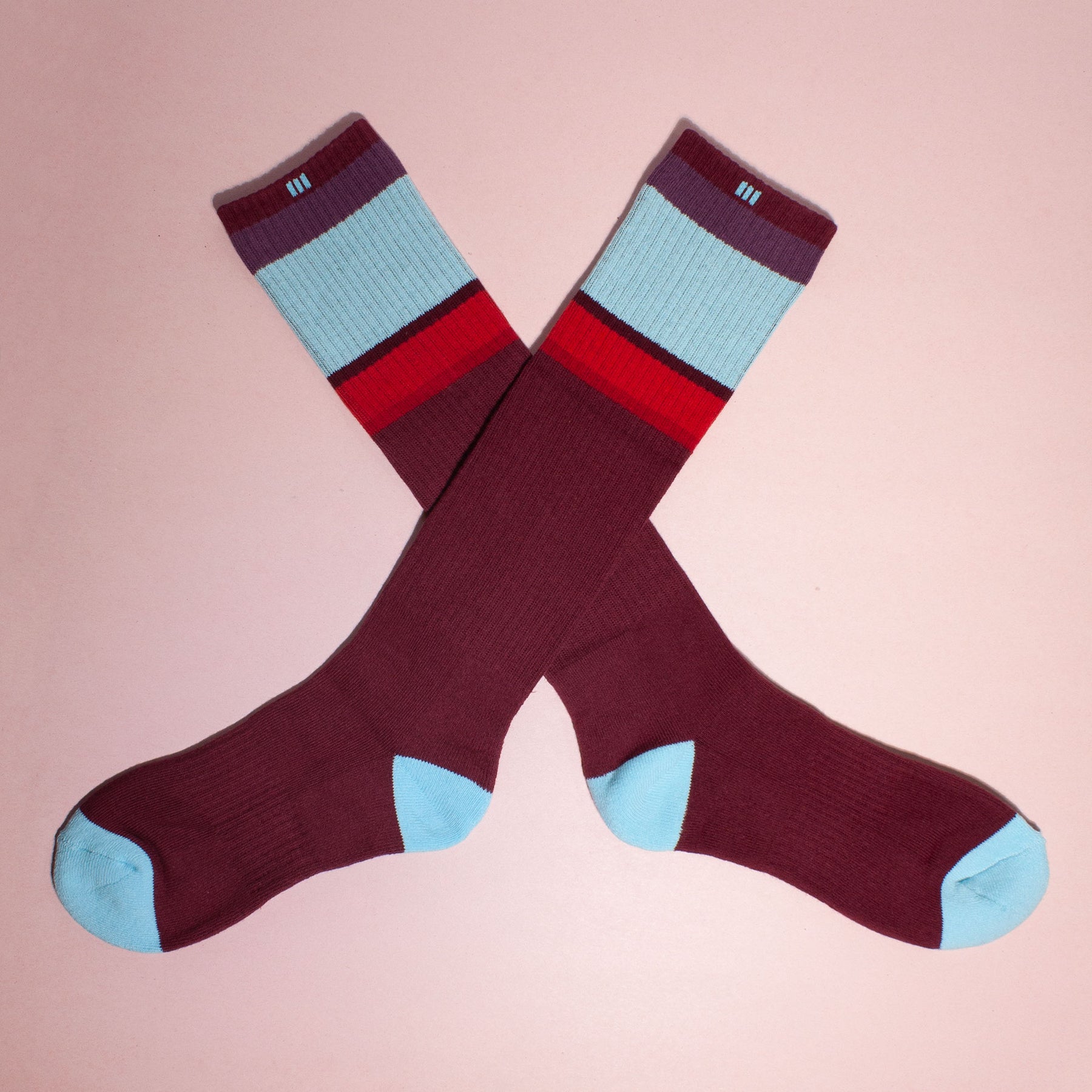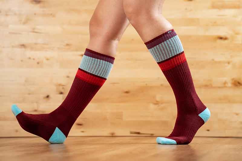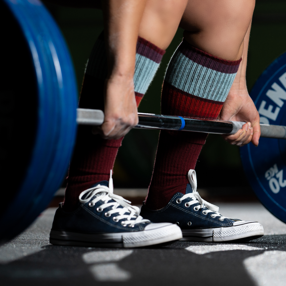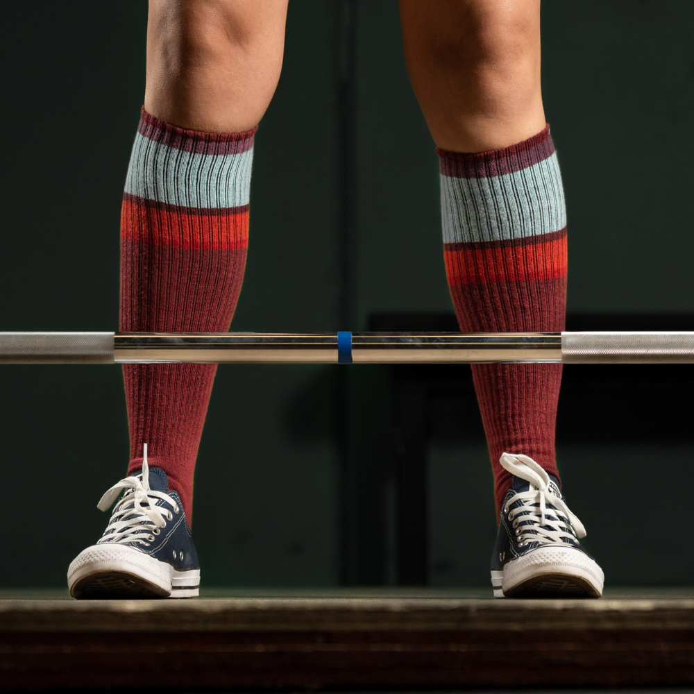 Our original design combines classic athletic stripes with unique colors so you stand out on the platform. Medium-thick material protects your shins from bruises and scrapes. The cotton-blend offers breathability when you are working hard. The material stretches to fit calves up to 20 inches with mild compression. Arch support and extra padding on the heel and toes make these a great option for lifting without shoes.